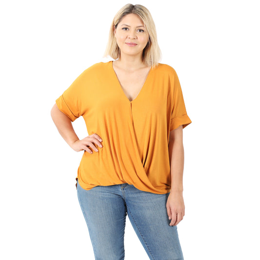 PLUS RAYON SPAN CREPE LAYERED-LOOK DRAPED FRONT TOP