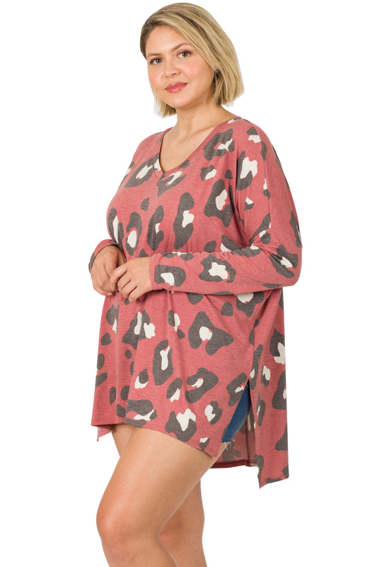 PLUS LEOPARD DOLMAN LONG SLEEVE HI-LOW HEM TOP