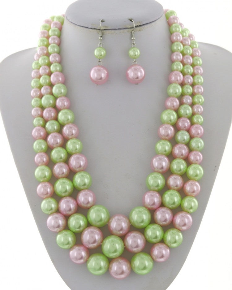 TRIPLE STRAND PINK AND GREEN NECKLACE SET